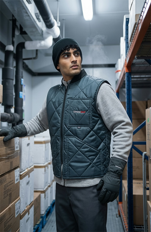 Durable Diamond Quilted Vest for cool temperature. Blue Color. Ideal for cold storage facilities.